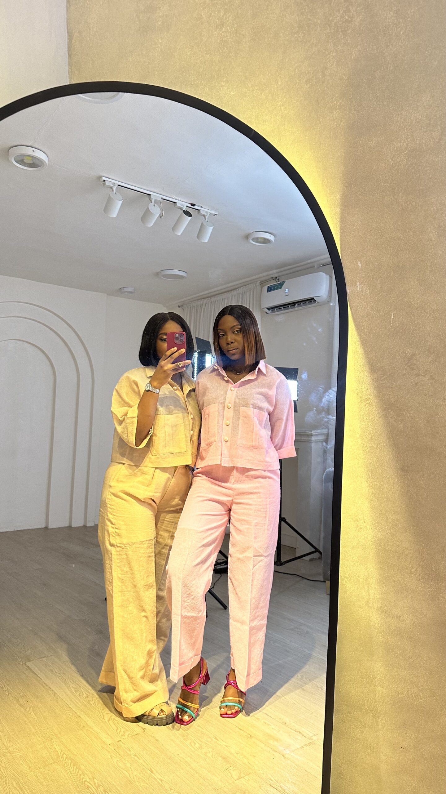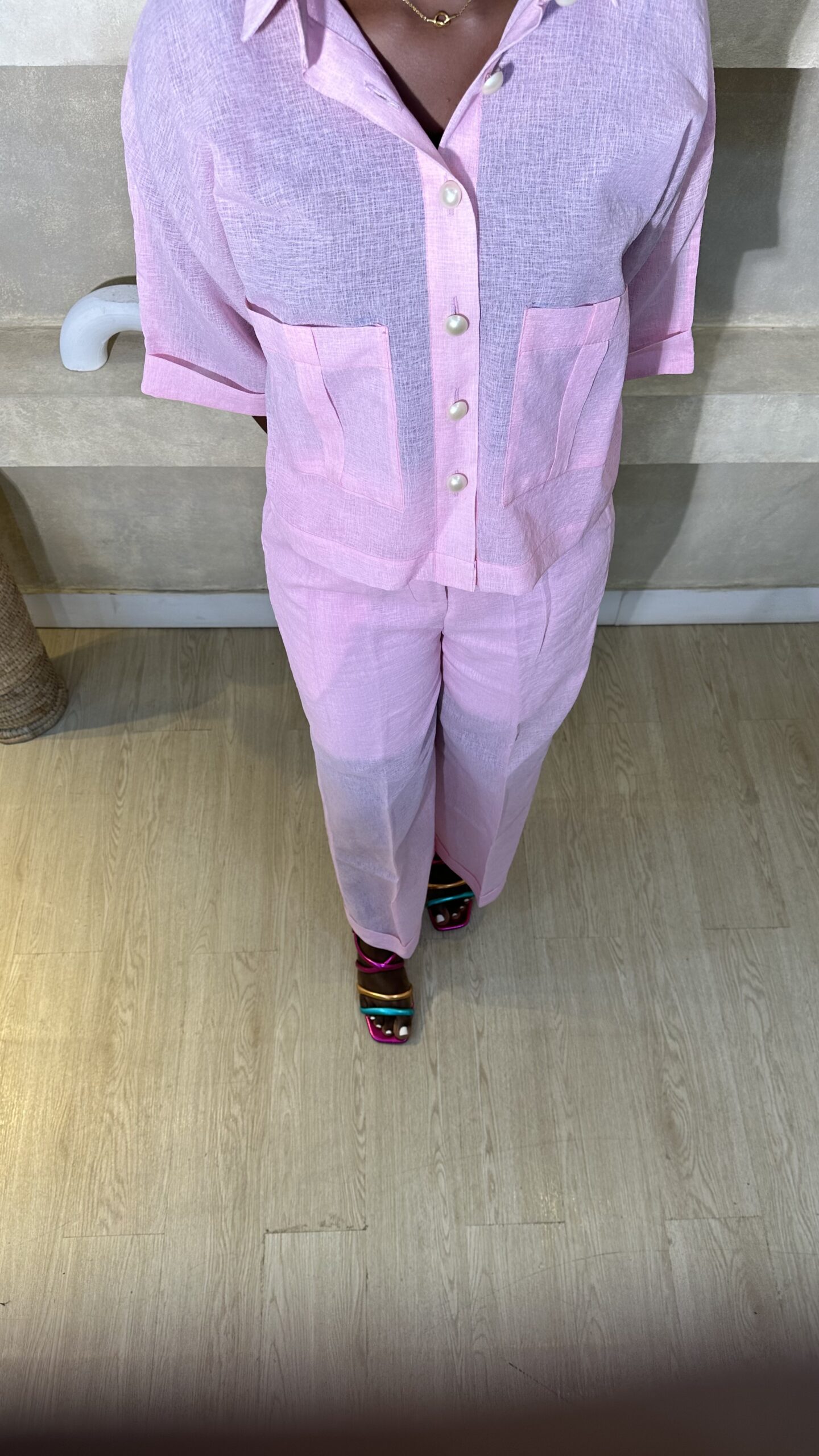 Made from a blend of Linen and Chiffon embellished with pearl buttons